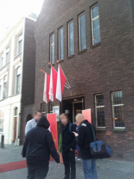 Na het nodige zoeken waar de auto geparkeerd kon worden waren we (WesleyB en ik) onderweg naar de Dom. Het was niet moeilijk zoeken want de Assassin's-vlaggen hingen al buiten aan de muur. Na een kwartier in de kou te hebben gestaan was het zover, Assassin's Creed: Revelations, we mochten naar binnen en konden plaats nemen voor een korte toelichting waar niemand minder dan Arie Boomsma het podium opkwam om dit te doen.