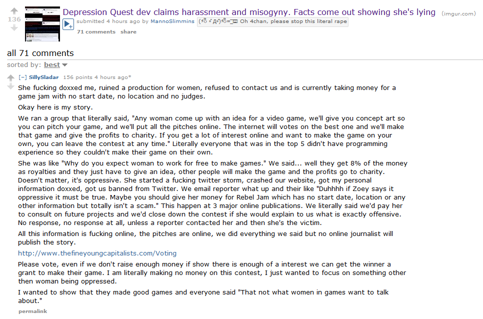 4chan werd na verloop van tijd de 'kathedraal van misogynie' genoemd door 'Ariel Connor' (een pseudoniem). Waarom? Veel leden van 4chan doneerden geld aan The Fine Young Capitalists. Volgens Quinn was dat bedrijfje transfoob en misbruikte het vrouwen.