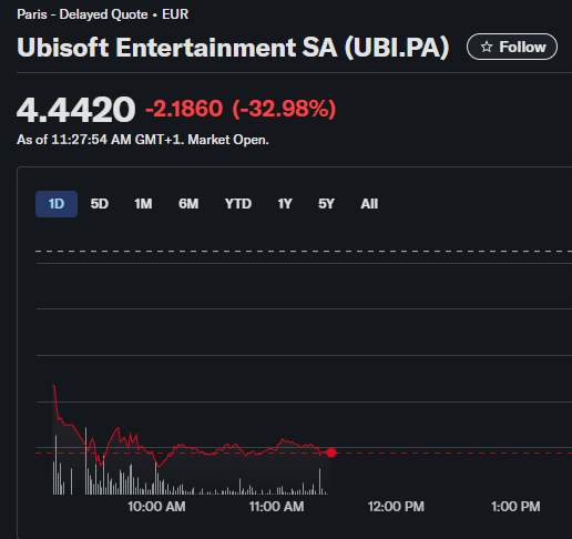 Het gaat niet bepaald lekker bij Ubisoft. De Franse gamegigant zag donderdag het aandeel op de beurs van Parijs keihard onderuitgaan, waarna de handel zelfs tijdelijk werd stilgelegd. In korte tijd verdampte bijna een derde van de beurswaarde, allemaal dankzij een weinig vrolijke waarschuwing voor een gigantisch verlies.
