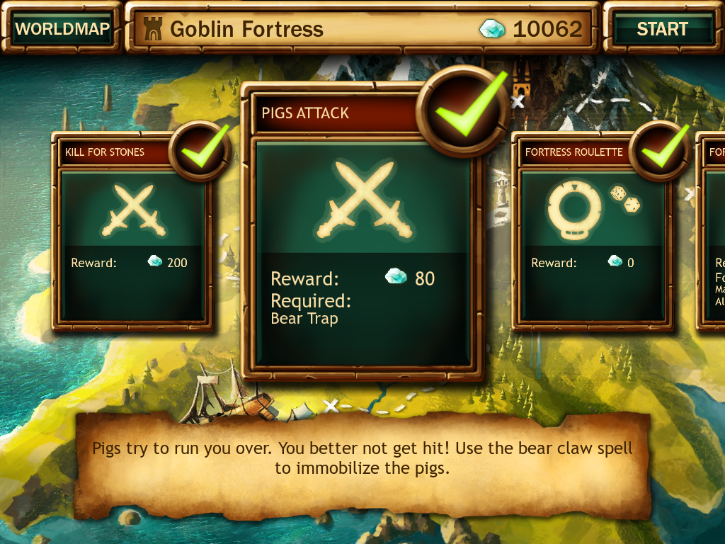 Er zijn in totaal zes levels met daarin andere opdrachten. Het verschilt per level hoeveel opdrachten er beschikbaar zijn. Vaak komt het erop neer dat je alle vijanden moet neerhalen. Soms krijg je een beperking in het type spreuk dat je mag gebruiken. Er is zelfs een eindeloze mode, zodat je helemaal los kunt gaan met je strategieën. De ideale opdracht om eens goed je tactieken door te nemen. Daarnaast zorgen die verschillende opdrachten ervoor dat je vaker het spel zult oppakken, omdat je een highscore kunt neerzetten.