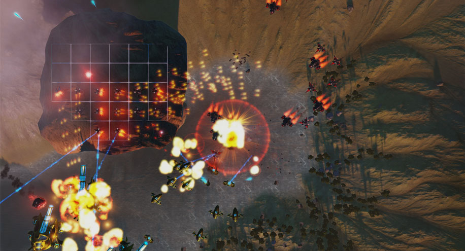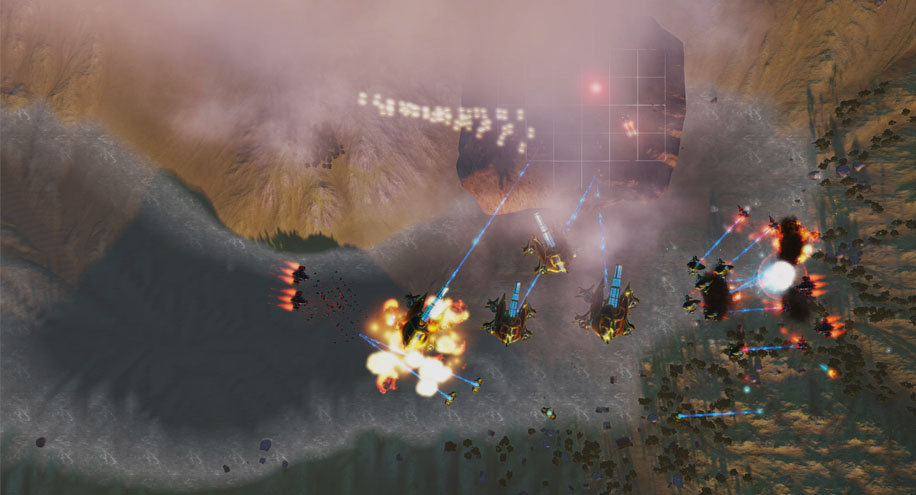 Nu kunnen we naar de kaart en zien we de vijand haar zetten doen en we kunnen ons ingestelde gevecht beginnen. We beginnen in een strategisch 3D-view. Eerst bekijken we de situatie op de kaart en geven we onze meegenomen units opdrachten. Artillerie gaat de vijandelijke basis op hun grondgebied aanvallen, terwijl lichte fighters de aanvallende vijand op een afstand van de artillerie houdt. Er zijn nog meer units te krijgen, maar in het begin is dit natuurlijk nog beperkt zoals in bijna elke RTS. De sterkste unit is de draak. Hij heeft een jetpack om snel door een level heen te kunnen vliegen en overal een flink handje, uh vleugel, mee te helpen. De jetpack zorgt ook voor een slowmotion-effect zodat je raketten makkelijker kunt ontwijken en de draak beter te positioneren ten opzichte van de vijand.
