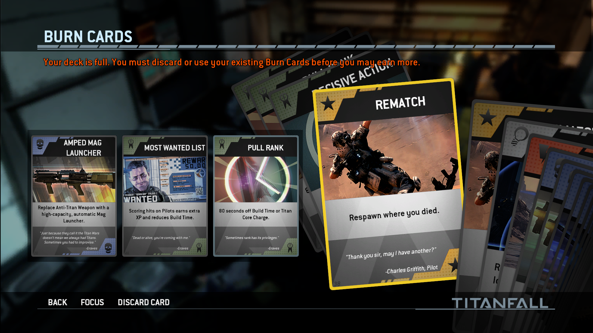 Er zijn ook nog burn cards. Dit zijn kaarten die je een extra boost geven om even flink los te gaan of om een bijna verloren strijd weer naar jouw hand te zetten. Je kunt hiermee bijvoorbeeld het wapen van je Titan veranderen in een veel sterker wapen of de herbouwtijd van je Titan verkorten.