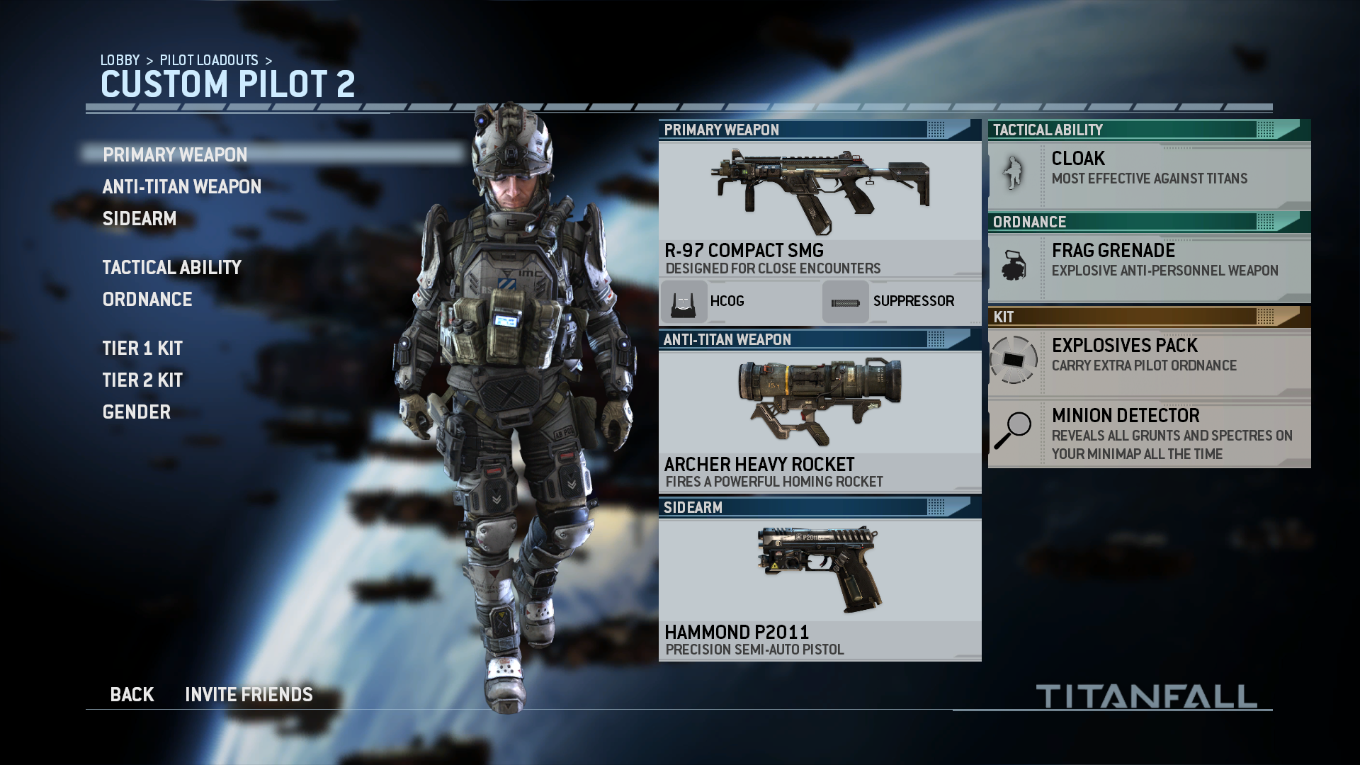 Dan moet er tussen hebbedingetjes in je kits gekozen worden. De Tier 1 Kit bevat een Enhanced Parkour Kit, waarmee je langer kunt wall-runnen en dergelijke, een Explosives Packje een extra granaat mee mag nemen (2+1), en een Power Cell die de hersteltijd van je Tactical Ability verkort. De Tier 2 Kit bevat, even kort door de bocht, bagger. Een Dome-Shield Battery die de duur van het schild om je Titan verlengt. Als je een Titan hebt opgeroepen, dan krijgt hij namelijk kort een schild om zich heen zodat je veilig je Titan kunt bereiken. Als je je Titan gewoon op een wat veiligere plek oproept, dan heb je zoiets niet nodig. Goed, nummer twee: een Minion Detector. Op het eerste gezicht lijkt dit een goede keuze: je kunt zien waar alle minions zich bevinden, maar aangezien ze niet echt een gevaar zijn en weinig punten opleveren, is het niet heel nuttig. Je kunt er wel enigszins uit opmaken waar de actie (en dus het vijandelijke team) is. Als laatste de Warpfall Transmitter: dit kekke hebbedingetje verkort de tijd tussen het moment dat jij je Titan oproept en de Titan op het slagveld neercrasht (Titanfall; ja, hij valt letterlijk naar beneden). Heel leuk, maar het is niet zo dat het normaal gesproken lang duurt. Deze kit mogen ze dus wel wat aanpassen.