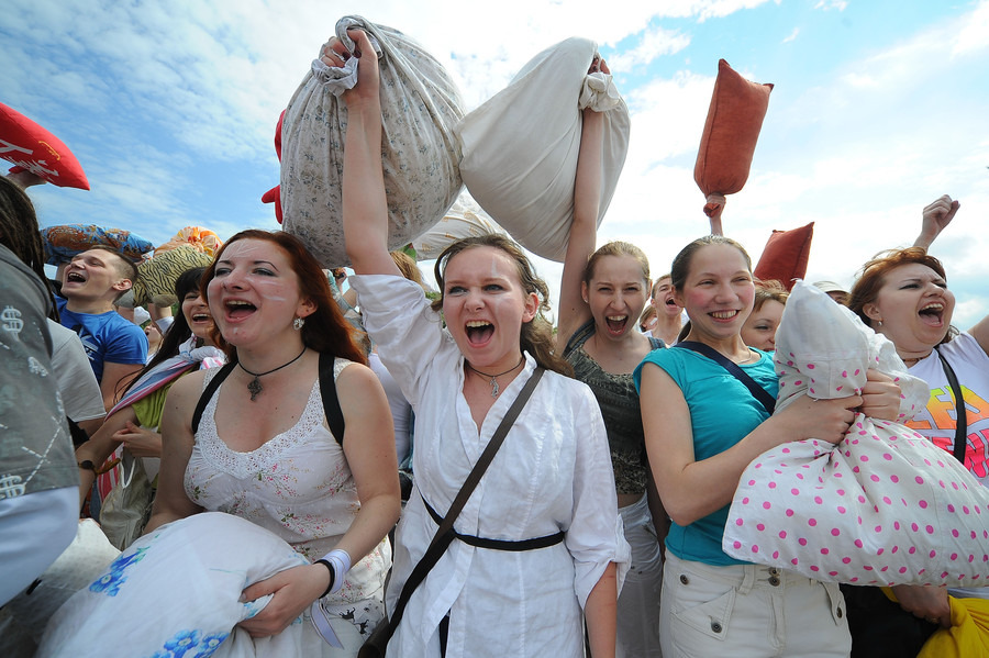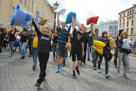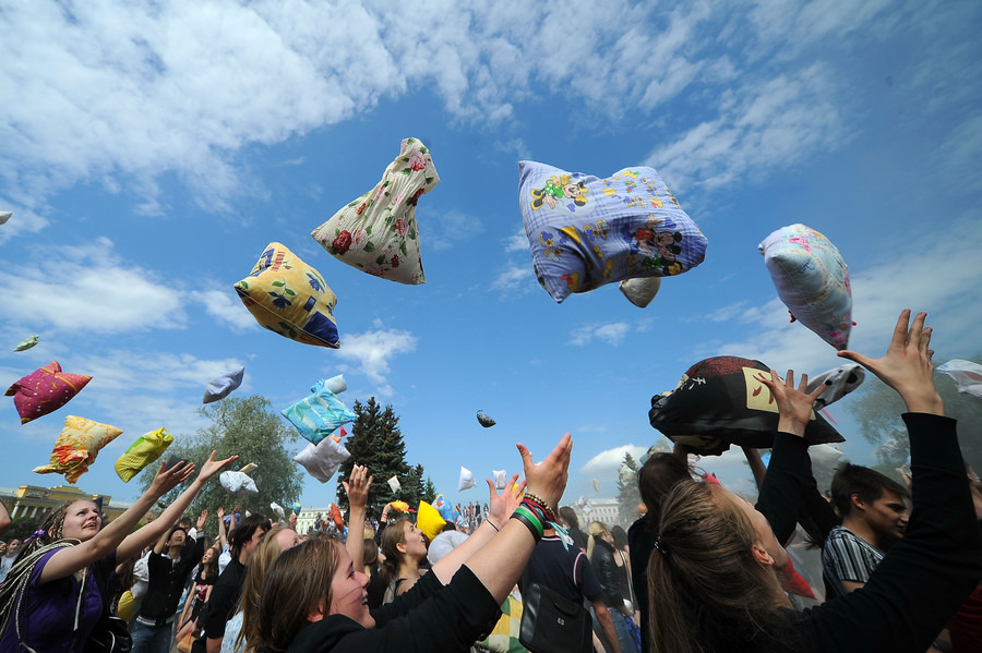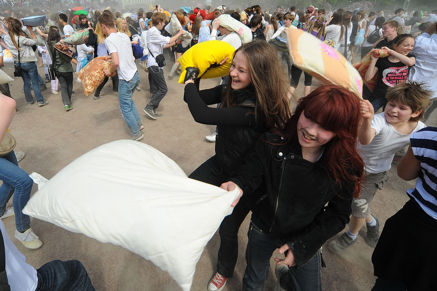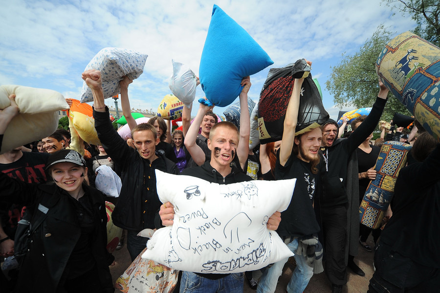 In St. Petersburg hadden de jongeren een stiekeme plan om op grote schaal een kussengevecht te houden. Zo te zien was het best gezellig, maar omdat er niet officieel een vergunning voor was, werden er wel 7 mensen gearresteerd.