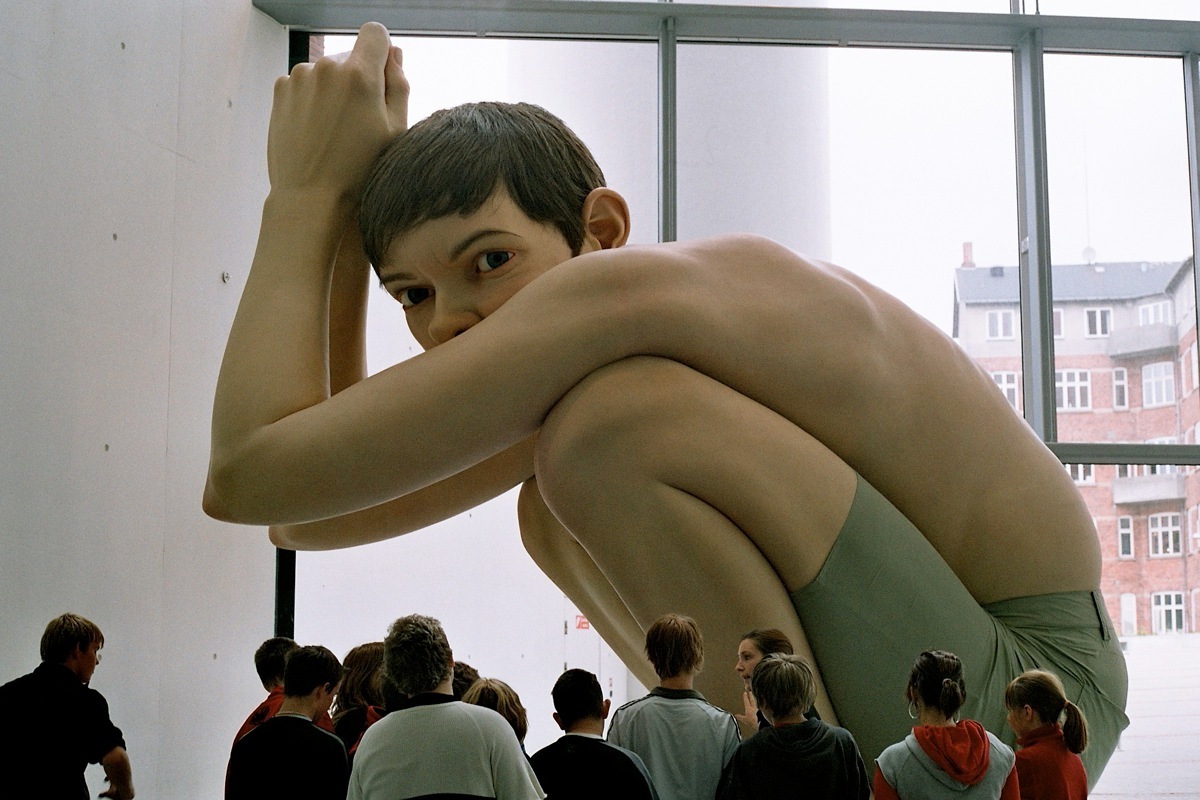 Ron Mueck maakt sinds 1996 hyperrealistische beelden in moderne materialen, combinaties van siliconen en fiberglas, bijvoorbeeld portretten van baby's, een hoogzwangere vrouw, een moeder met kind, van mensen in verschillende stadia van ouderdom en zelfportretten, maar niet in dezelfde grootte: hij maakt beelden in diverse afmetingen, van minuscuul tot zeer groot. Daarbij gebruikt hij veel realistisch materiaal, bijvoorbeeld kippenvel, adertjes en haartjes.