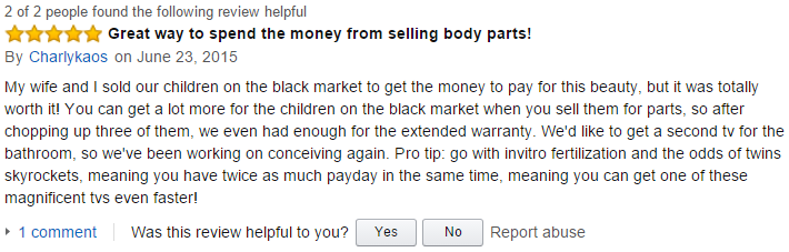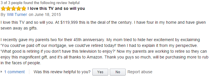 Samsung heeft een hele fraaie 105" Curved UHD tv te koop op Amazon.com. De prijs; een schamele $120.000. Die prijs was voor veel mensen aanleiding om een aantal nogal sarcastische reviews te plaatsen.